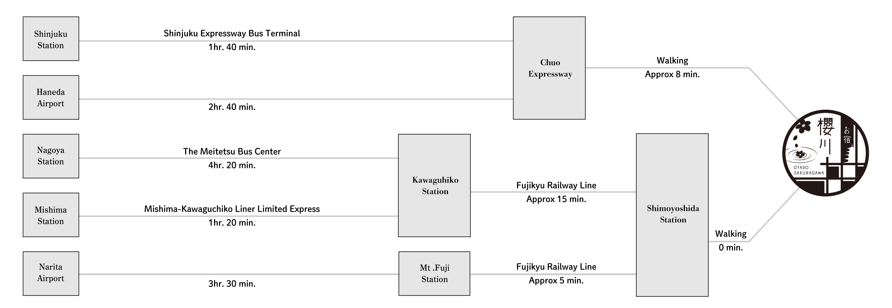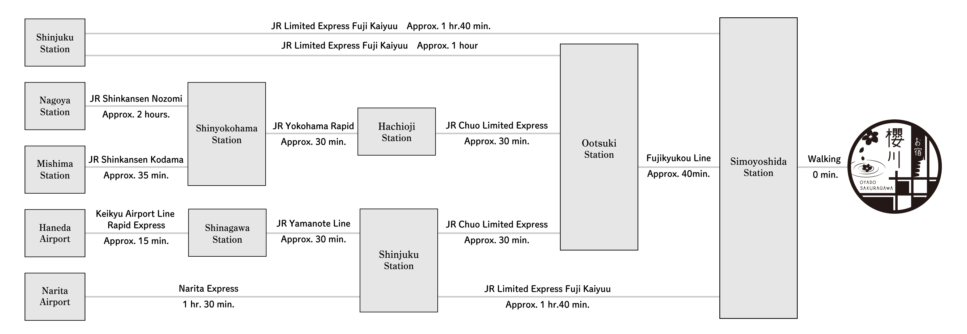 Oyado Sakuragawa is a very convenient location for sightseeing around Mt. Fuji with excellent accessibility, just a 0-minute walk from Shimoyoshida Station, where the limited-express train stops.