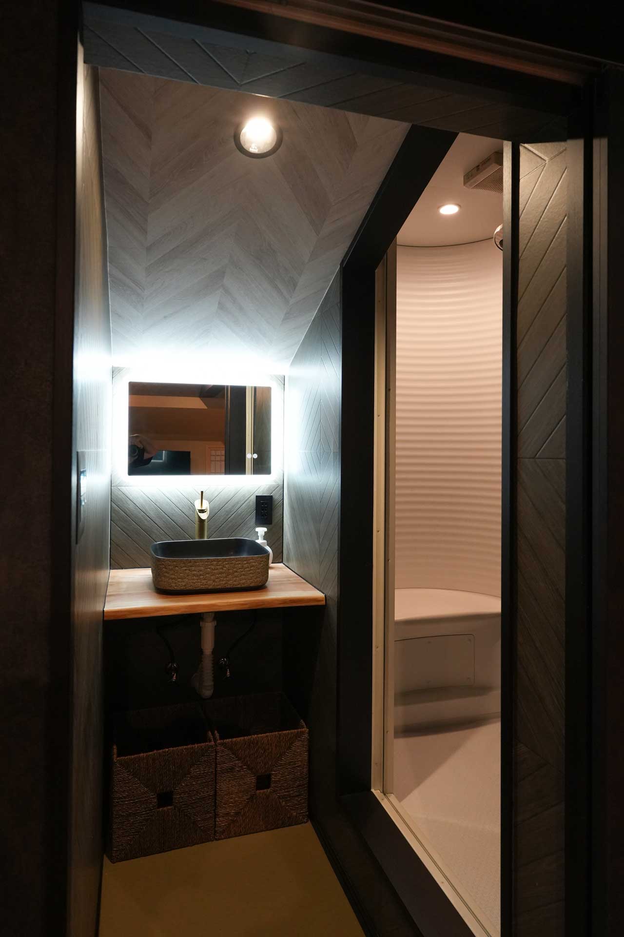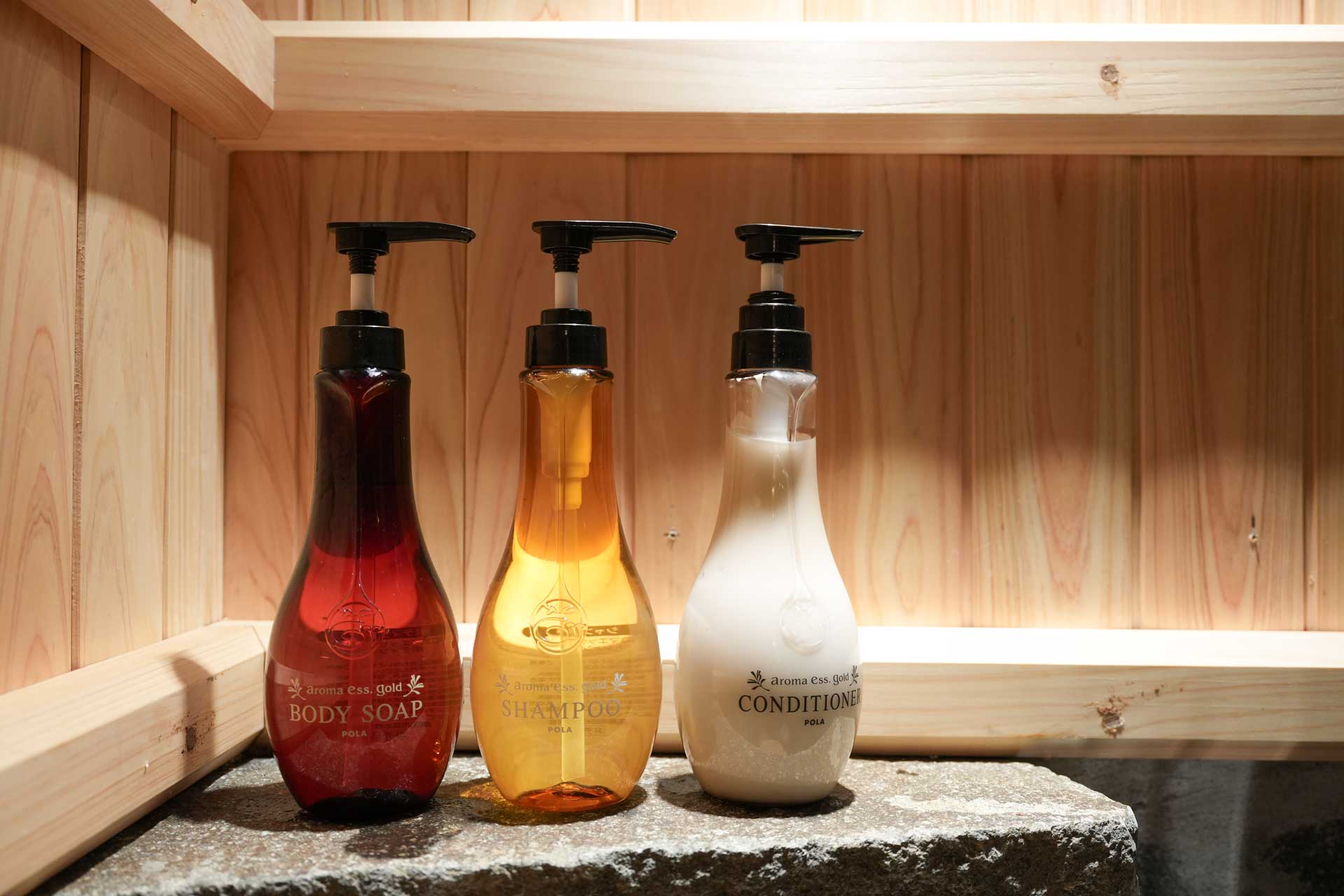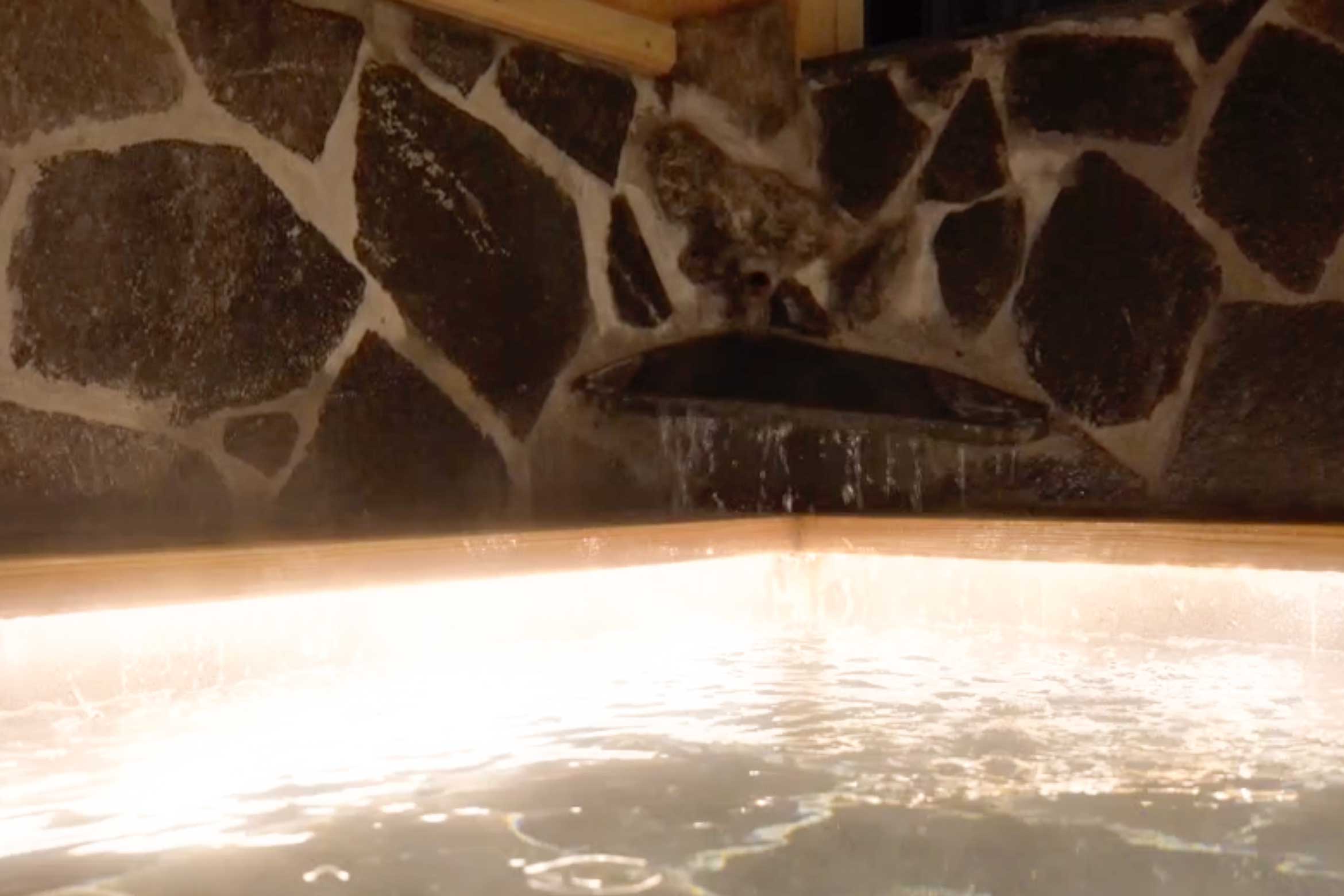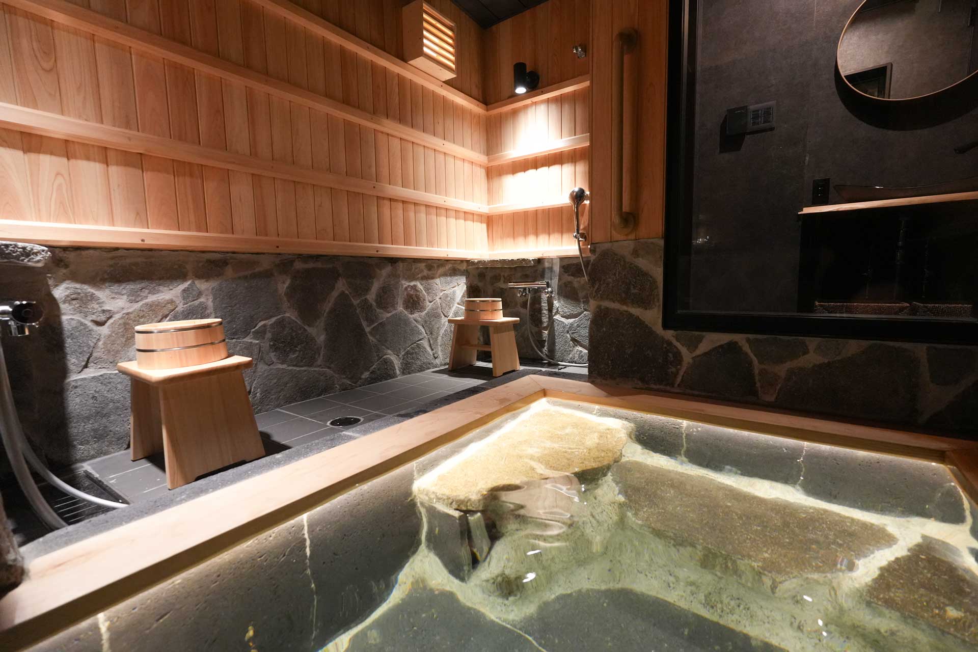The luxurious private bath, an artificial hot spring, is made of natural lava rock and Japanese cypress, and can be used freely during your stay.
