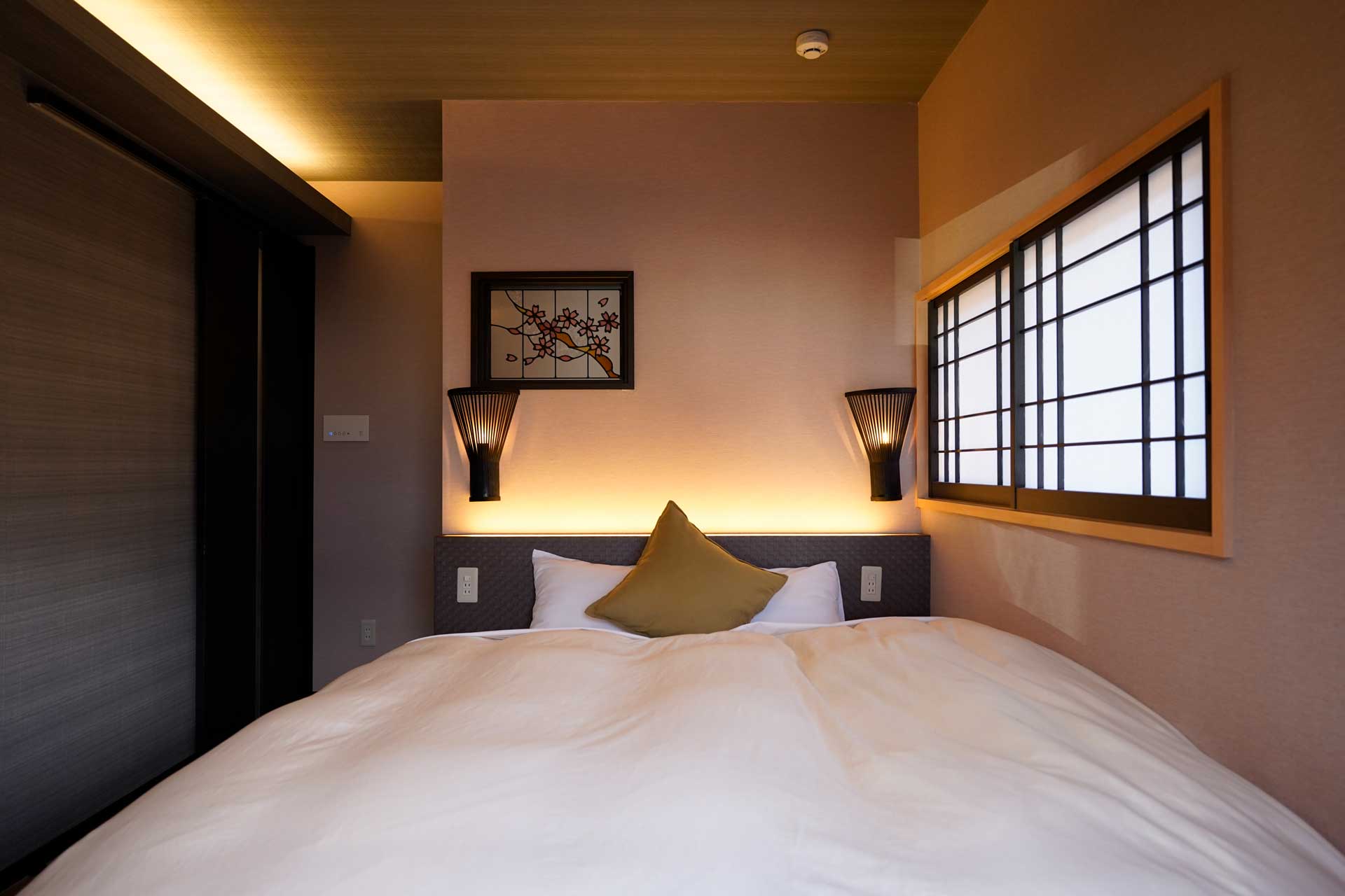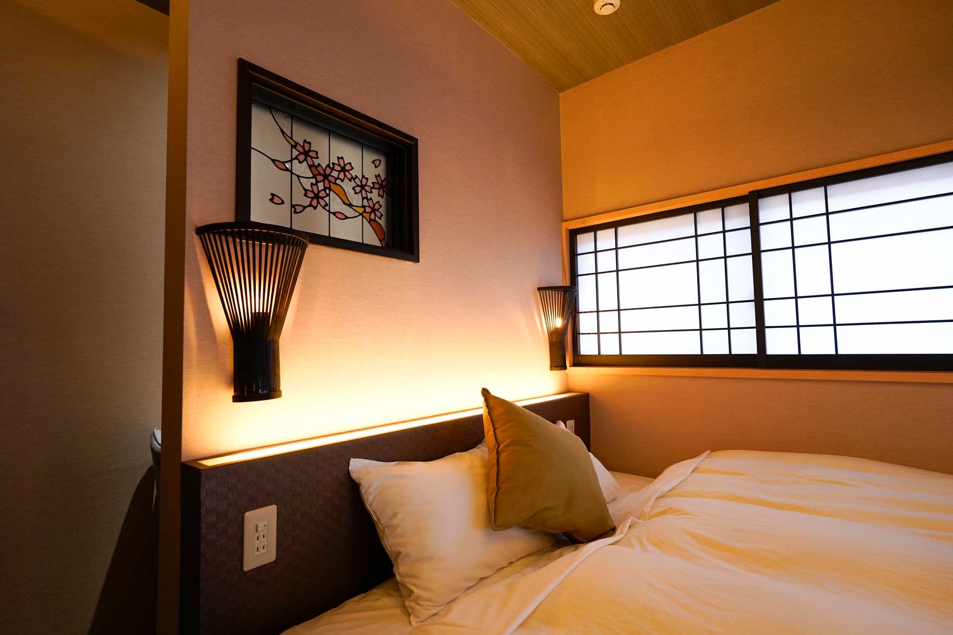 Enjoy a good night's sleep surrounded by gentle light on the semi-double bed designed with the theme of Princess Sakuya enshrined at Arakurayama Sengen Shrine and the twinkling of the moon.