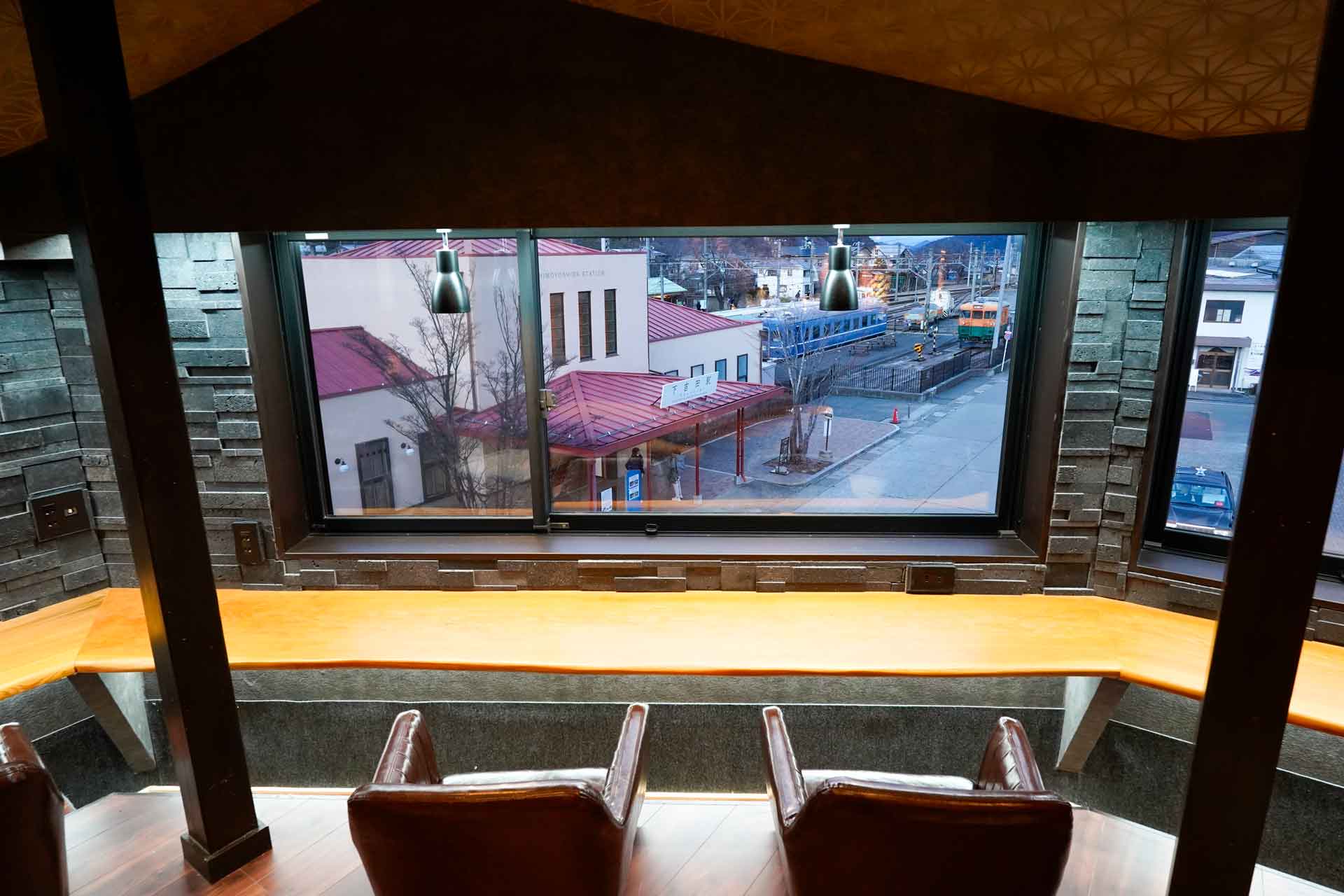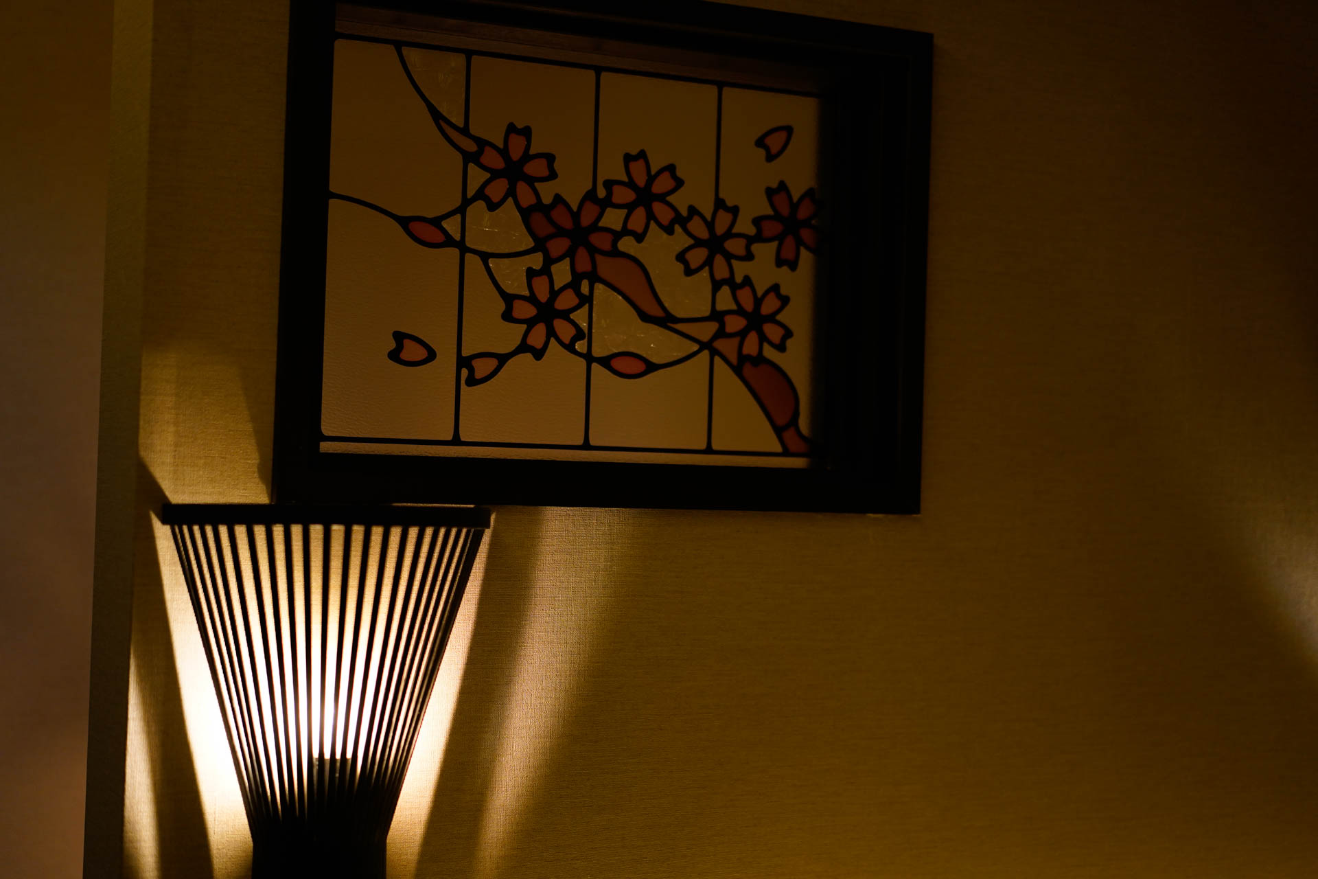A gorgeous room with a king-sized bed with impressive stained-glass windows featuring Princess Sakuya and falling petals, and wide windows overlooking Mt. Arakurayama and Shimoyoshida Station.