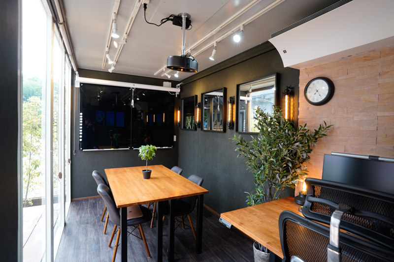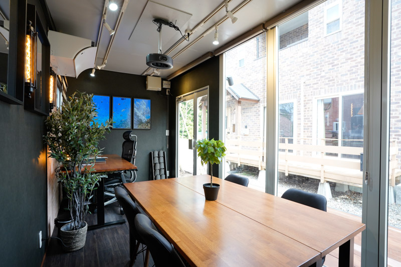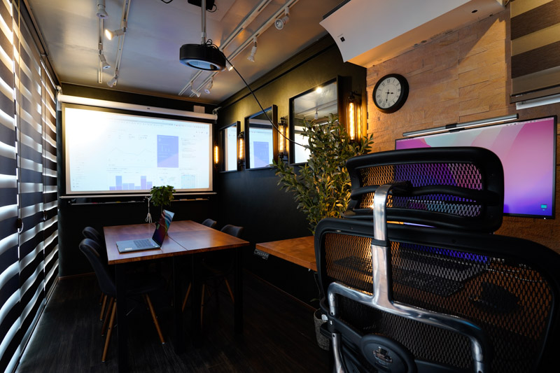 設備:エアコン、会議テーブル×2、チェア×4、昇降デスク×1、エルゴノミクスチェア×1、モニター×1、レーザープリンタ×1、ホワイトボード(ガラスボード)、バーチャルアクアリウム